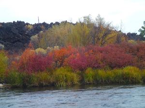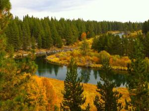 The transition from summer to fall catches us by surprise, often with a cover of clouds banking across the usually cloudless skies of the high desert region. In the next three photos, the blue of summer is toned with the gray of impending fall. With a few frosty nights under our belts, we are now being treated to the flaming reds and golds that reflect on the water and make every paddle almost sensory overload. Dennis captured a series of photos that share the diverse personality of the Dillon Falls section of the Deschutes River south of Bend. Celebrate the energy of this season. Put on your booties (and your safety gear, brrrrrrrrr if you do fall in) and immerse yourself in the brief, but exquisite, gift of fall color. Don’t forget the camera.