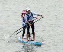 Crucial to successfully completing the elite race course is the choice of SUP board. Heather explains, “Nick Leason owner of MHL custom and shaper Greg Jaudon and myself decided to design a true unlimited board that could suit my daughter and me as a tandem board or super fast unlimited board for the solo guy. The board is 16′ x 25″ . This may seem narrow, but really the longer the board the more narrow you can go. MHL has the magic touch for stability. These guys are amazing. ” By the way, the mother-daughter team finished 5th overall females and 1st in class with a time of 2:44:06.