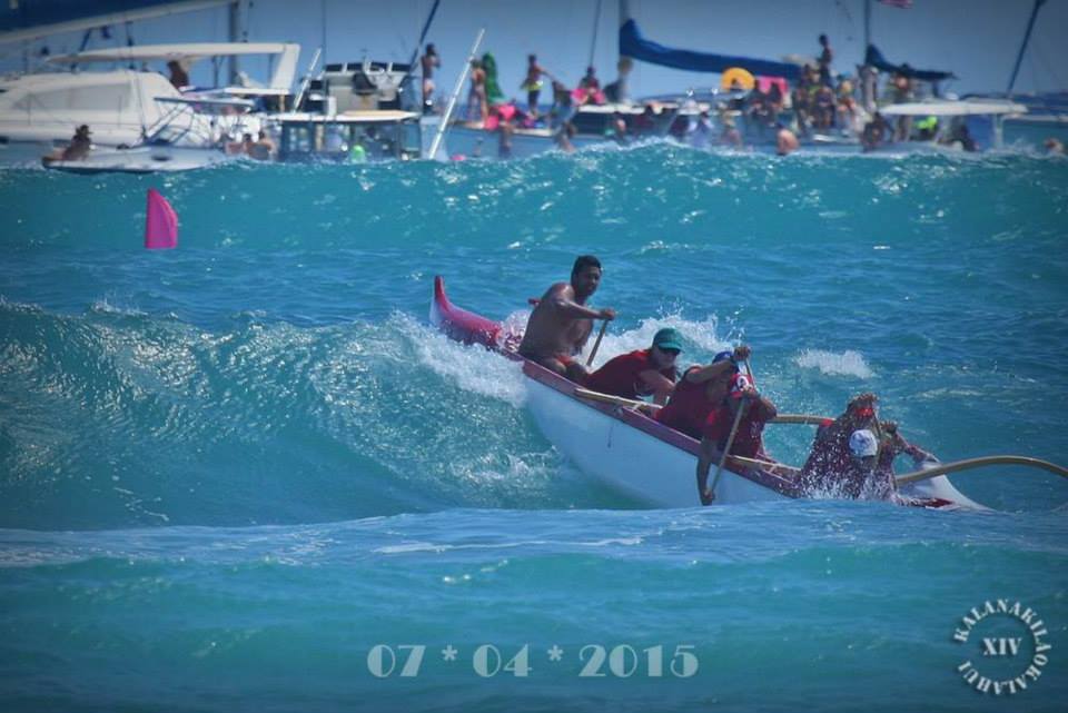Most outrigger regattas plot a course that runs parallel to the beach.  In the McFarlane Regatta there is a fair amount of surf potential and the course runs out through the surf and then back in. Jane McKee explains, “For the 2015 regatta there was surf, and extreme tide changes. Those conditions made for a very disorganized wave and unpredictable conditions. Many canoes hulied, broke or were swamped.