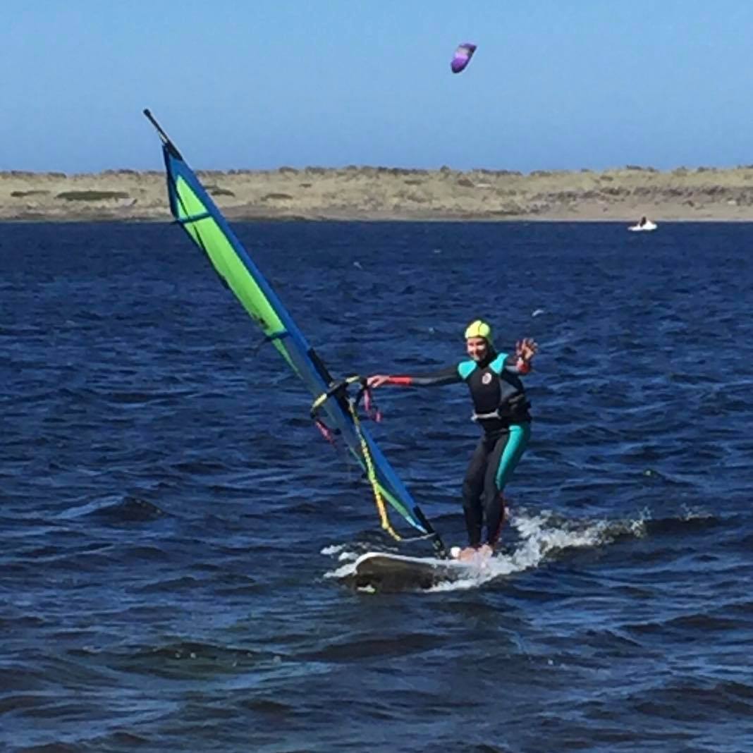 The coolest sail I had all summer was during a trip to the Southern Oregon coast, just south of Bandon to Floras Lake. I had scheduled a lesson with Floras Lake Kite and Windsurf – more for the security of someone watching over me in the 25-30+ winds than anything else. Since my sail is 4.5 I decided to use one of their lesson boards with a smaller sail, and a shorter, more agile board. The day was cold and intimidating. Like wild things, kiters were criss-crossing the lake with exhilarated grins. I stepped onto the unfamiliar board and felt its tippy shape test my balance as I hauled up the sail.