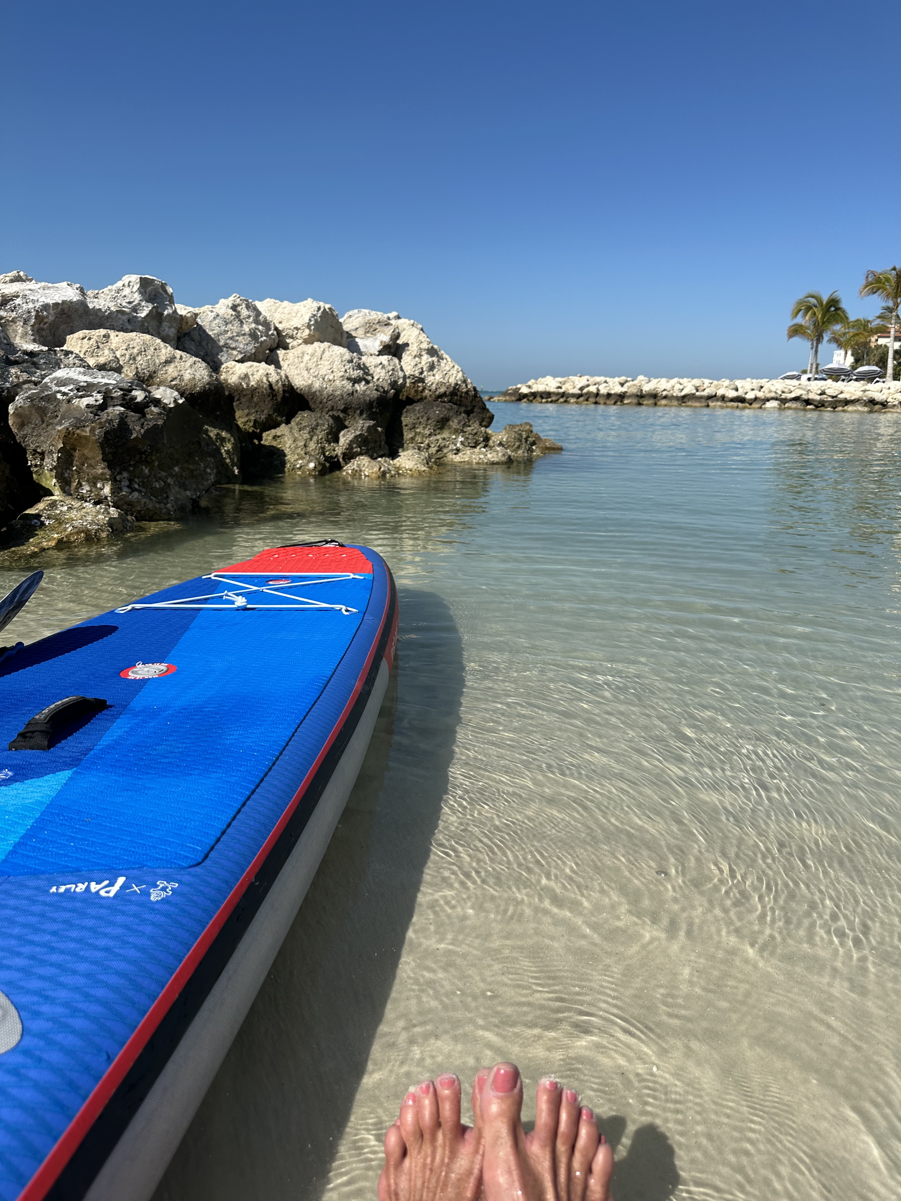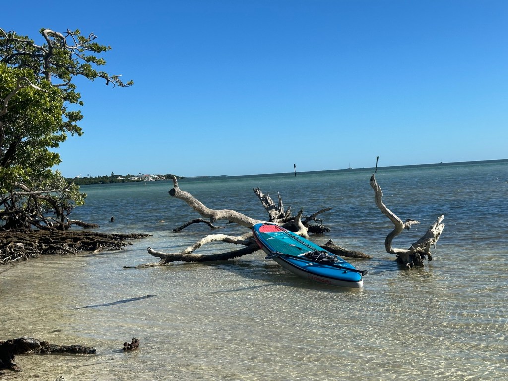 On the way I shared the water with dozens of sting rays of all sizes – it must have been time for lots of new born rays as mother-offspring duos flapped gracefully alongside me. When I was about 200 yards from the land bridge to the Gulf the low tide water was just inches deep. I took the fin off my Starboard 12’6″ Zen Touring board and paddled in by hand. At times a few regal osprey winked down at me in between feasting on the plentiful bait fish.