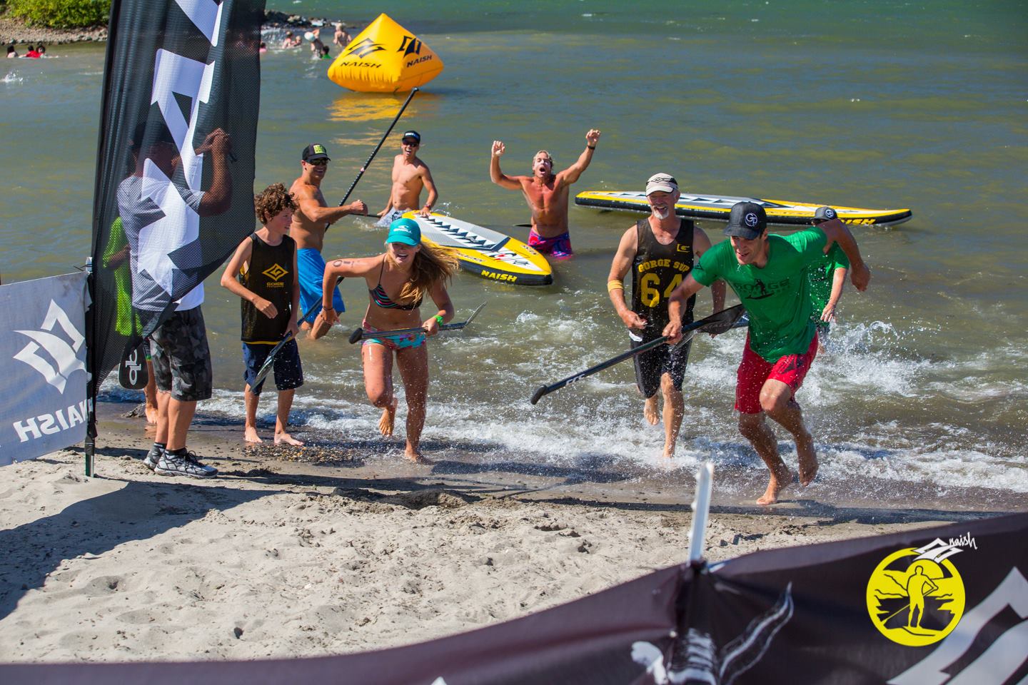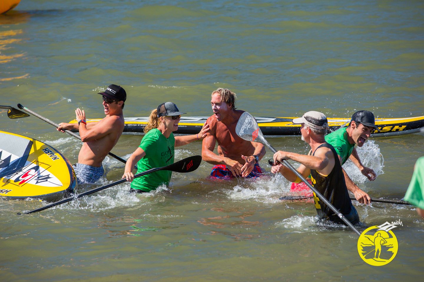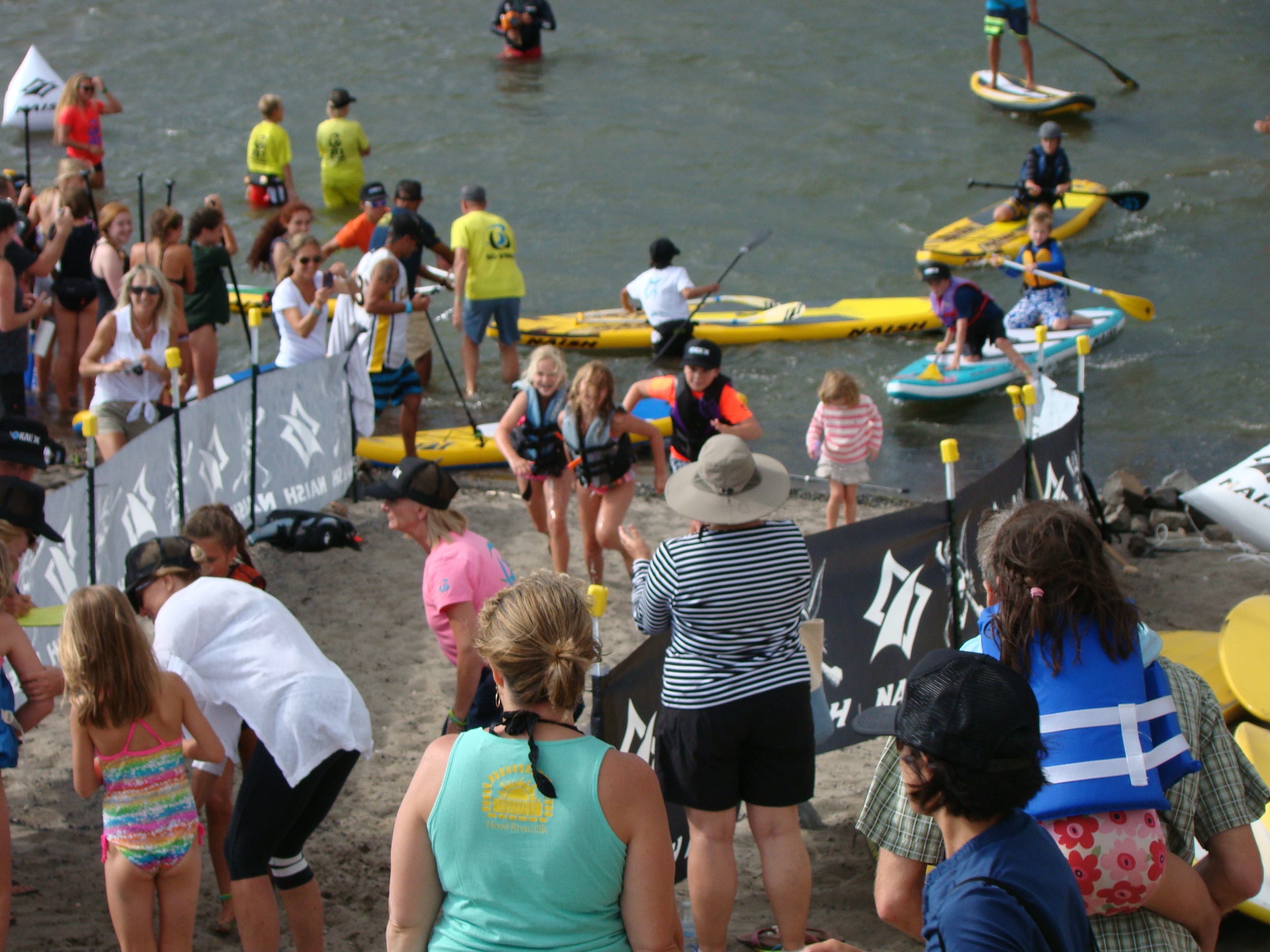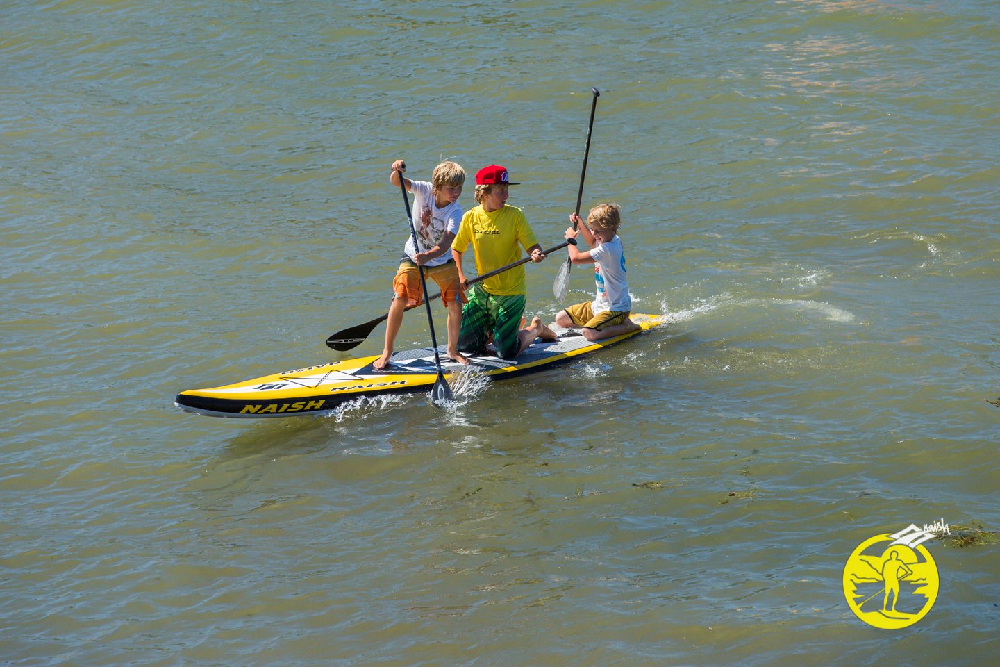 As he announced the rules, Steve Gates explained the fun-factor of the “race, “Go out and have a blast with the Naish ONE boards. They are inflatable and forgiving if you run into each other or fall off. They’re just right for any size or skill-level. This is a fun a event, be prepared to get wet and laugh.” Well, that is exactly what happened.