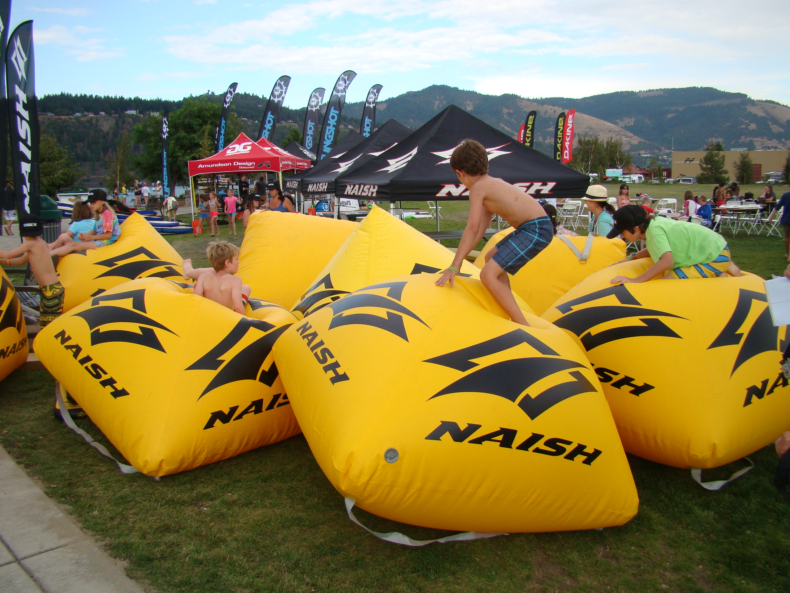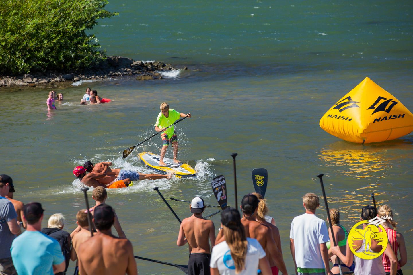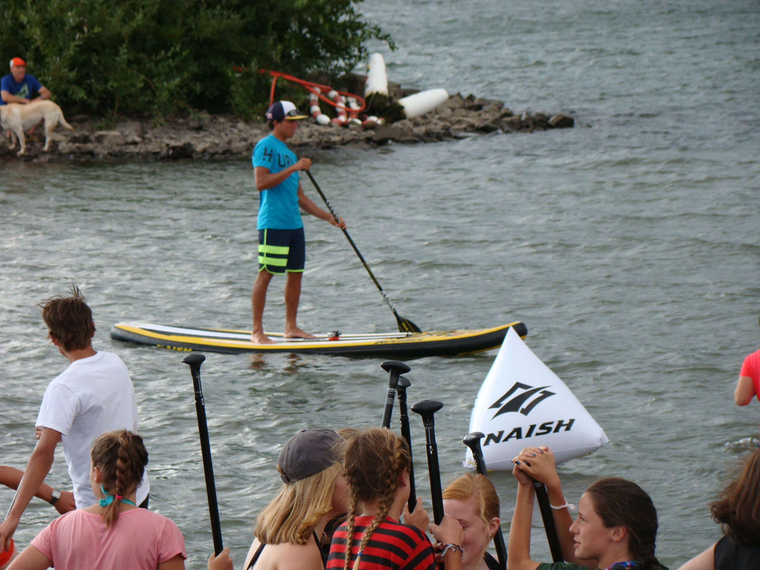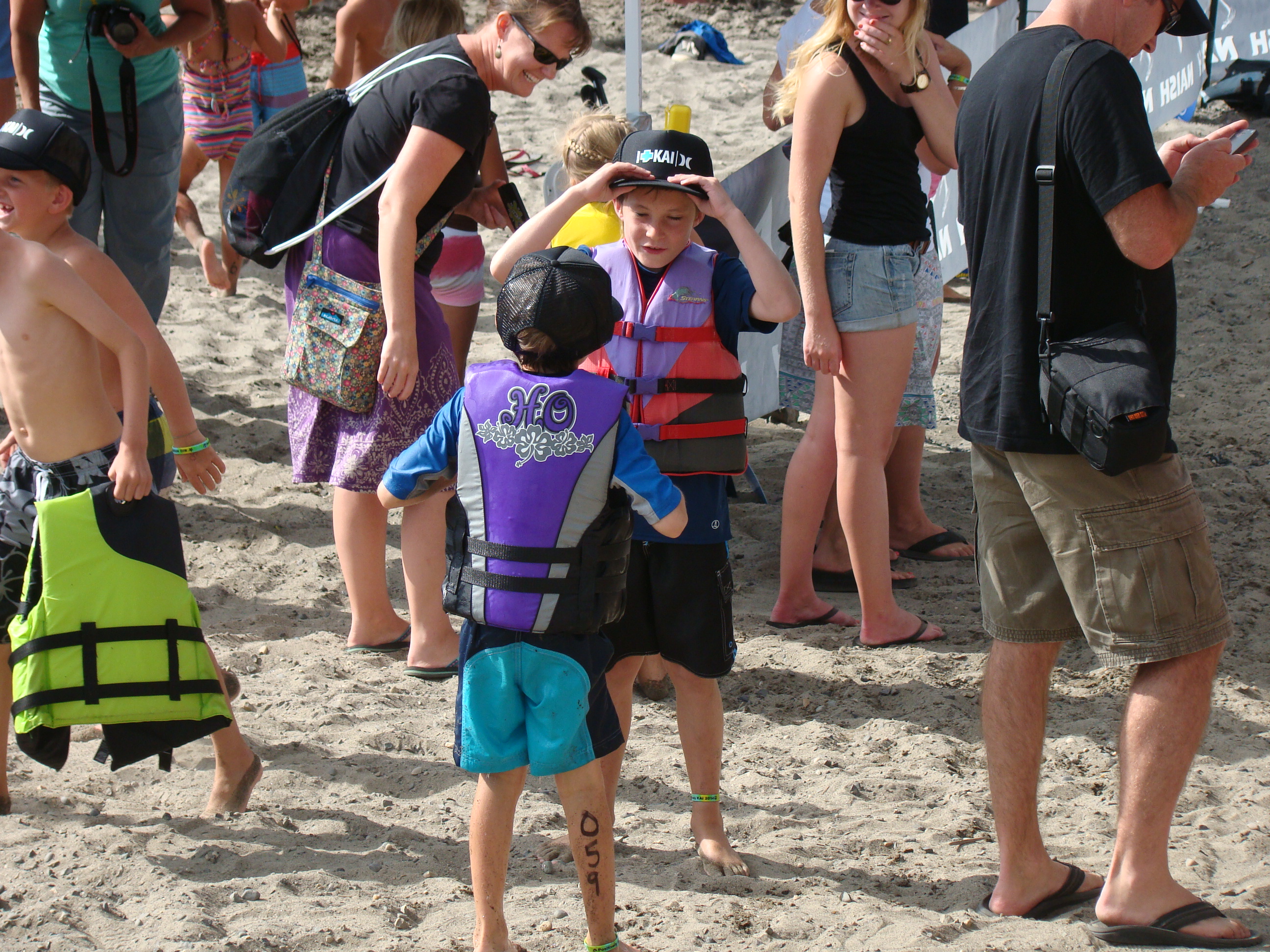As he announced the rules, Steve Gates explained the fun-factor of the “race, “Go out and have a blast with the Naish ONE boards. They are inflatable and forgiving if you run into each other or fall off. They’re just right for any size or skill-level. This is a fun a event, be prepared to get wet and laugh.” Well, that is exactly what happened.