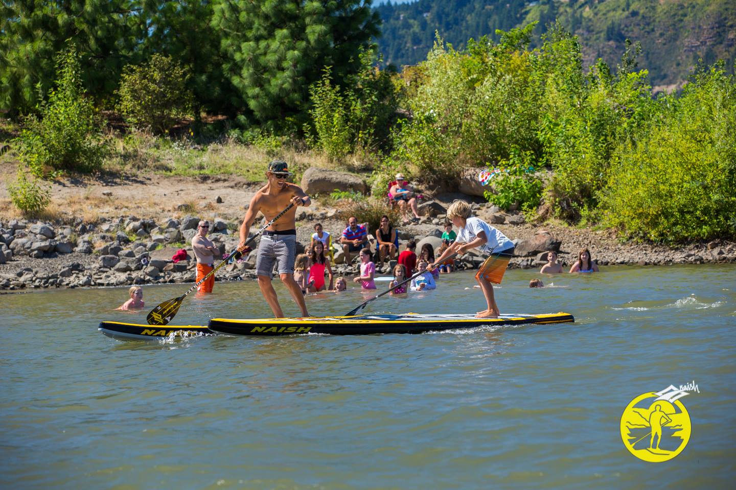 I didn’t have to wait long for the answer.  Steve Gates and the team from Naish had a super-cool event planned.  They had a fleet of Naish ONEs (12’6″ inflatable one-design boards) on the beach and ready for a team relay event – with rules that leveled the playing field for any participants. The Team Relay was a fun four person relay race  contested on a short course right in front of the spectator viewing area at the Waterfront Park (Hood River, OR) . Each Team was required to have at least one athlete under age 16 and one female. The young paddler and the female couldn’t be the same person. Elite athleteswere placed onto teams by the Race Director, Steve Gates of BigWinds. The Relay Race was run all on Naish One boards,